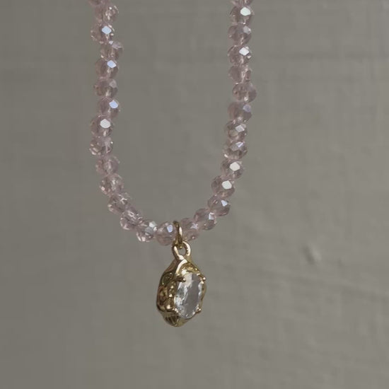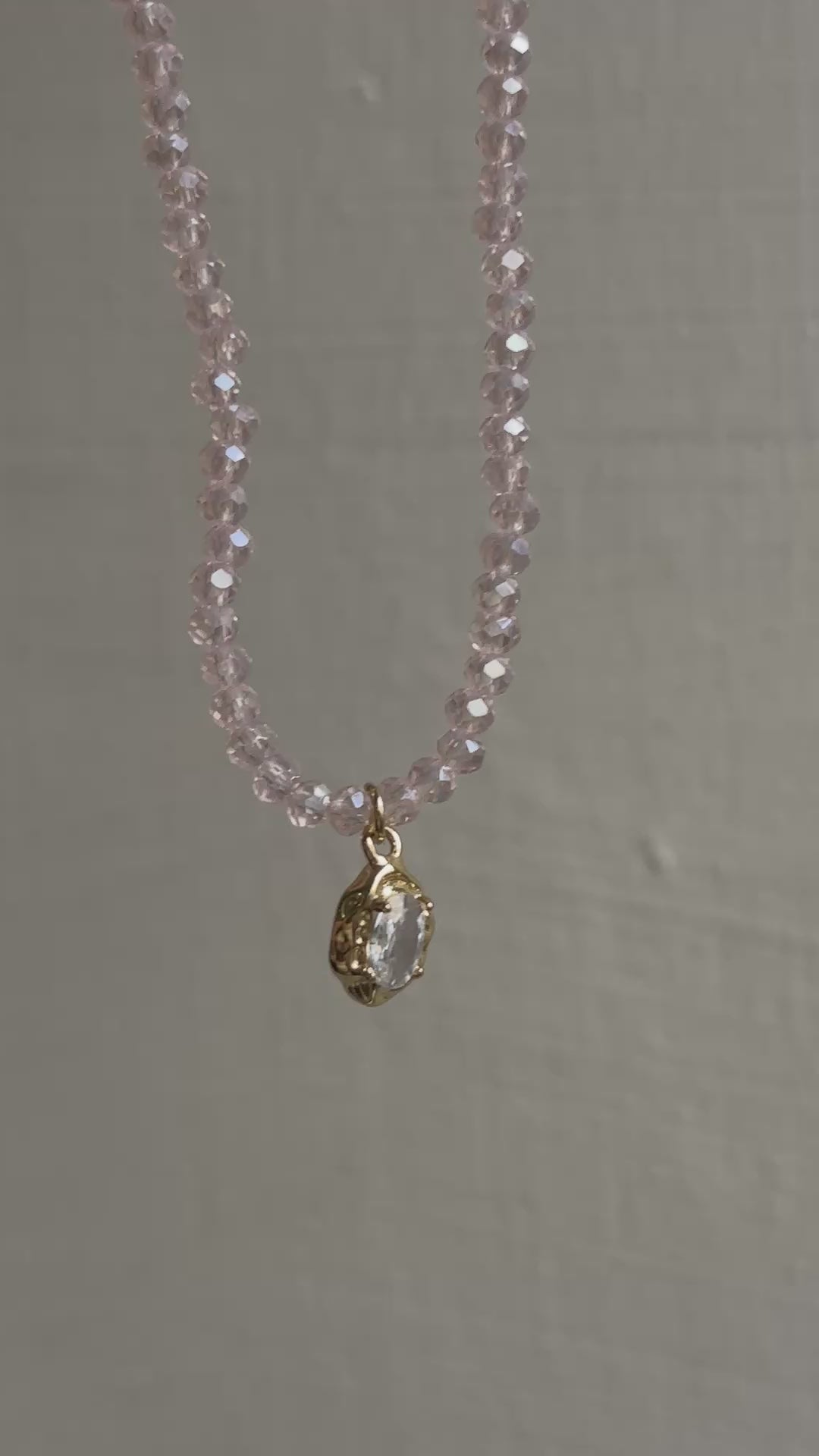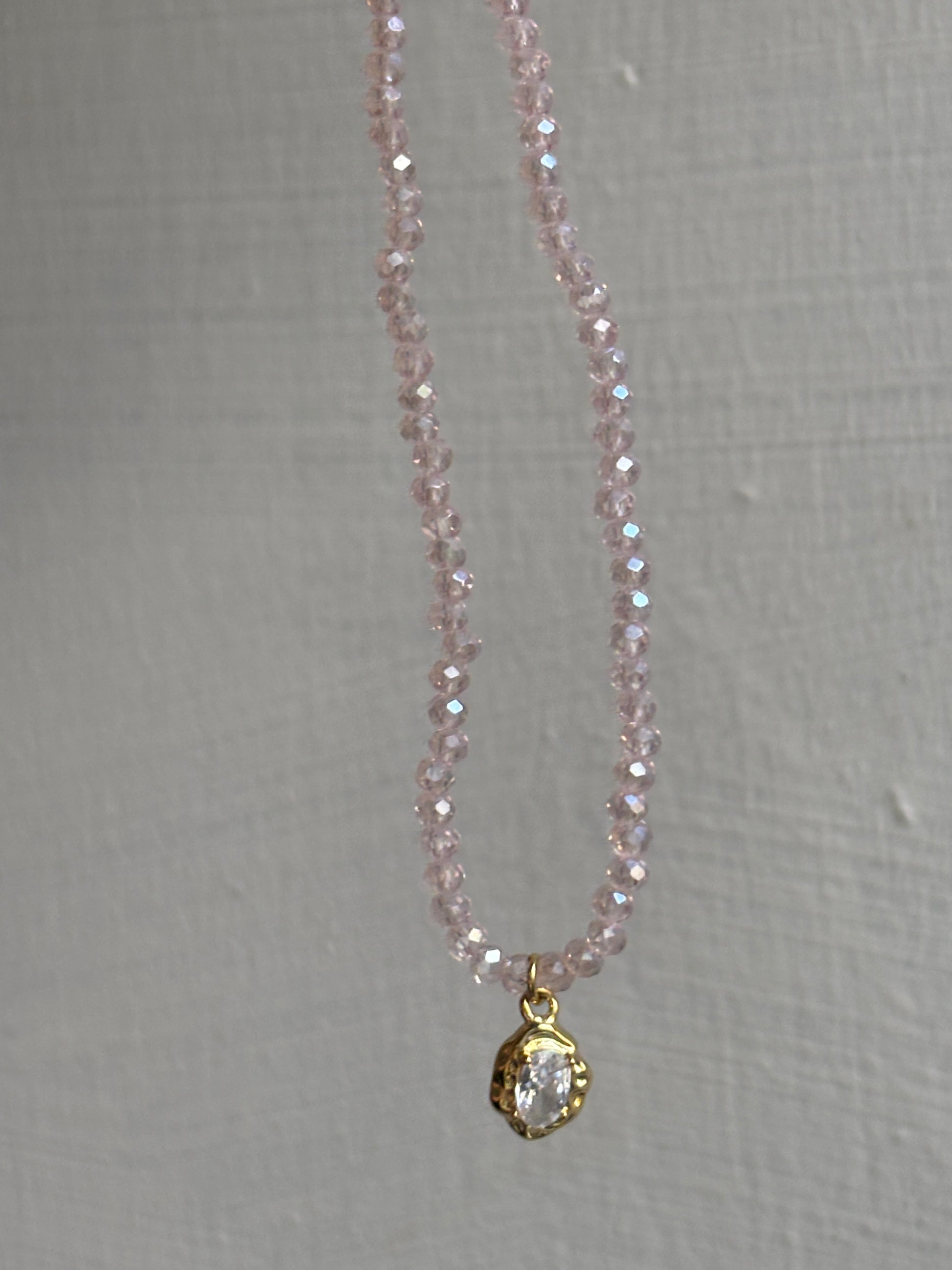 Collar con mini cristales checos rosado pastel y dije abstracto dorado con zirconias en oro laminado.