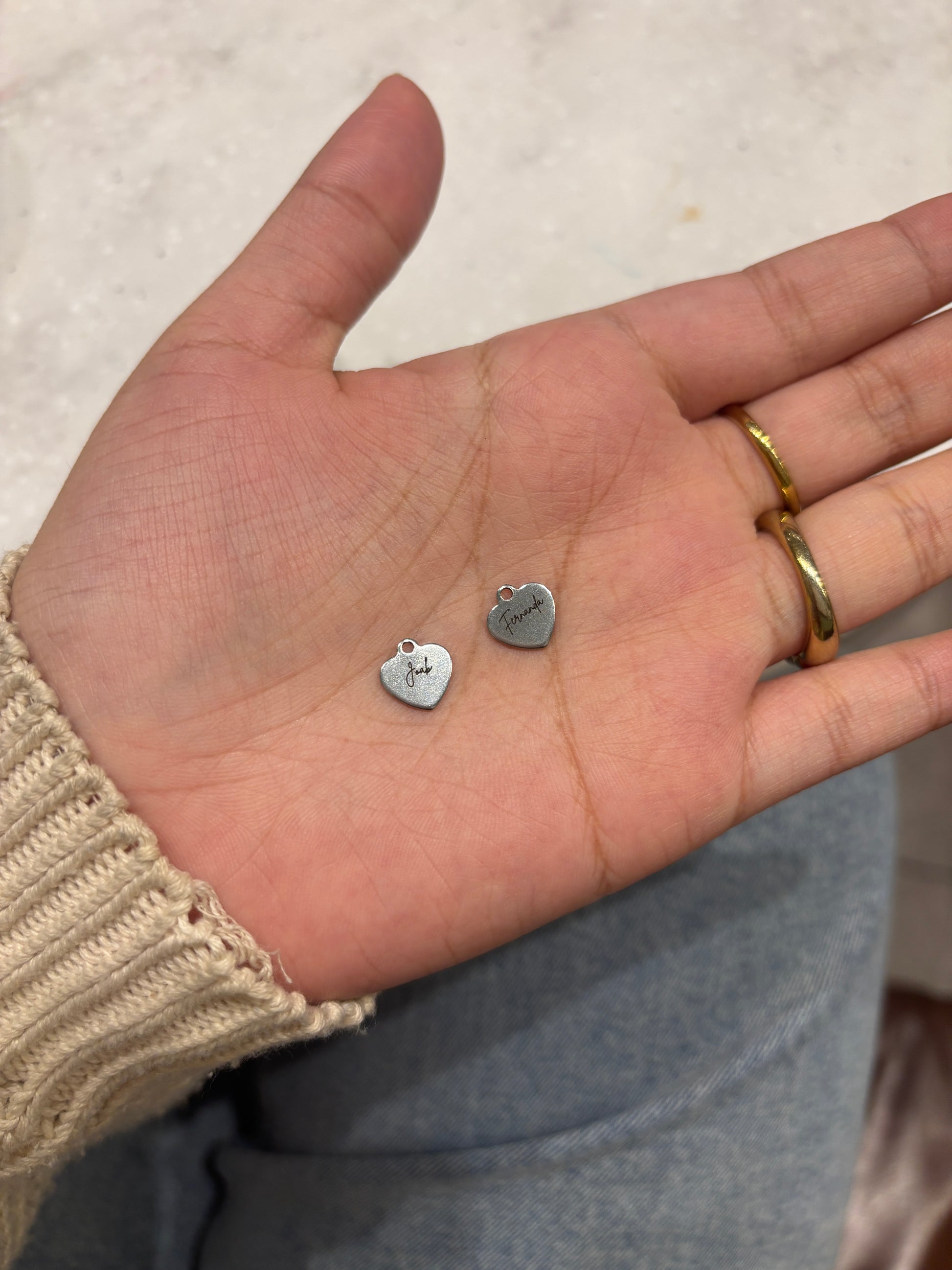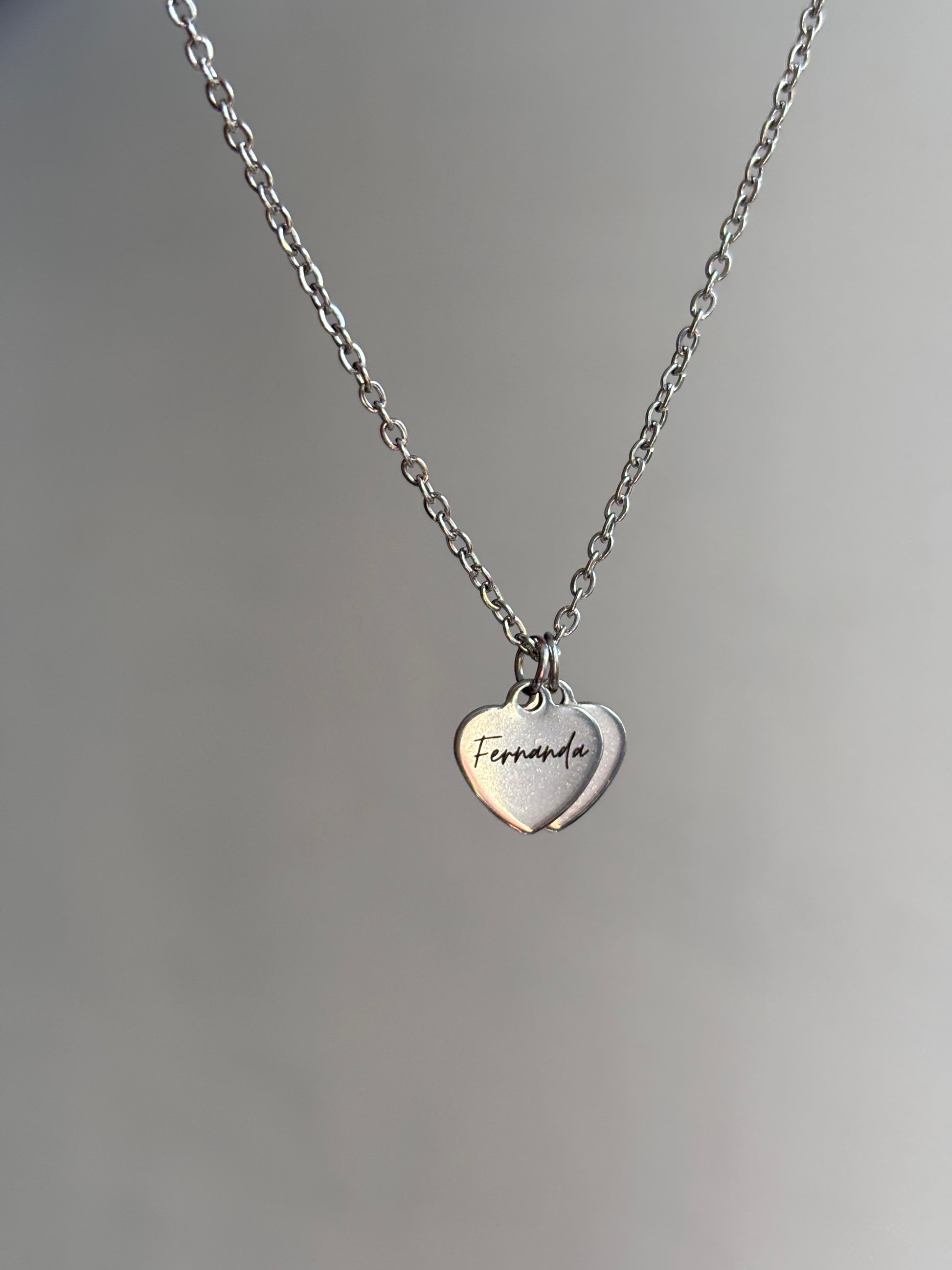 Collar con plaquita de acero inoxidable en forma de corazón con grabado personalizado.